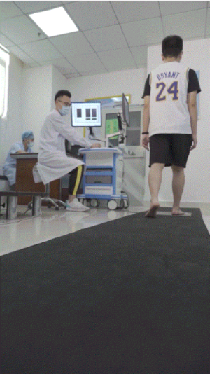 该测试要求被测者在装有传感器的压力板上站立或行走,期间显示屏会实时出现足底压力变化图像,医生通过分析图像判断被测者足底有没有问题,包括扁平足,高弓足,足弓塌陷,足跟的不稳定,踝关节的内外翻等。