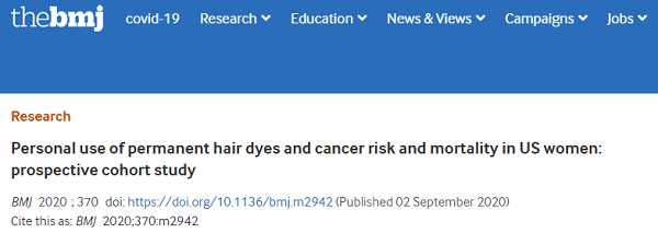 [5] Zhang Y , Birmann B M , Han J , et al. Personal use of permanent hair dyes and cancer risk and mortality in US women: prospective cohort study[J]. BMJ (online), 2020, 370:m2942.