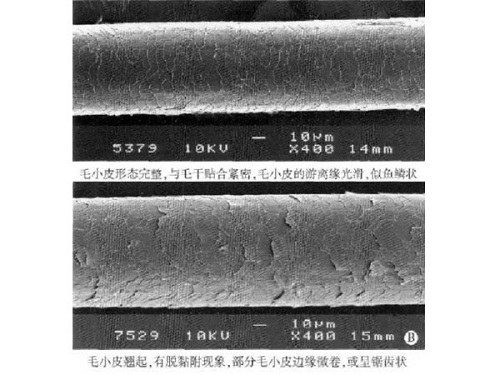 上图为正常头发扫描电镜下形态,下图为染发后头发扫描电镜下形态。[2]