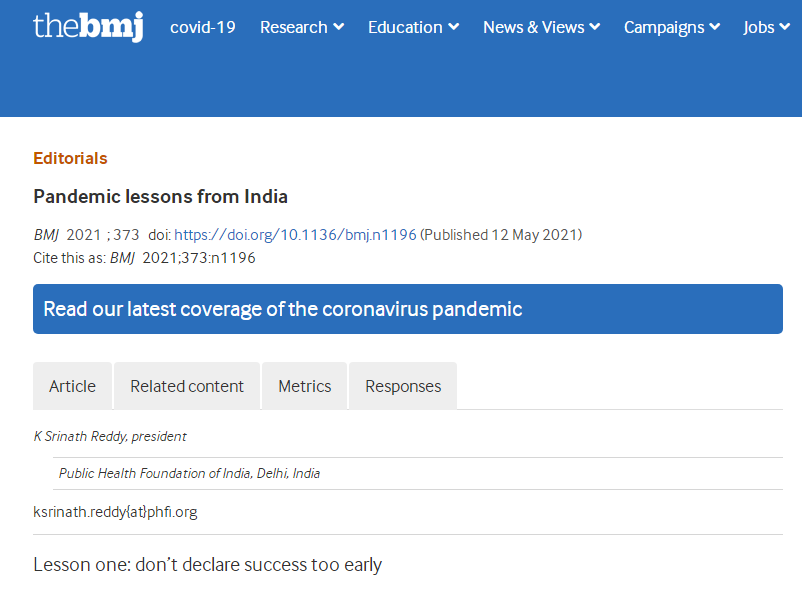 Reddy K S. Pandemic lessons from India BMJ 2021; 373 :n1196 doi:10.1136/bmj.n1196