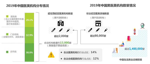 根据艾瑞咨询《2020年中国医疗美容行业洞察白皮书》数据显示,合法合规开展医美项目的机构仅占行业12%,将近九成的机构存在“无证经营”、“超范围经营”等情况。黑医美机构事故频发,近10万人致死致残。医美非法从业者达十万以上,合法医师仅占行业28%,无证行医人数众多。