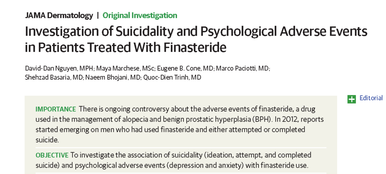 [1]Investigation of Suicidality and Psychological Adverse Events in Patients Treated With Finasteride. JAMA Dermatol. Published online November 11, 2020. doi:10.1001/jamadermatol.2020.3385